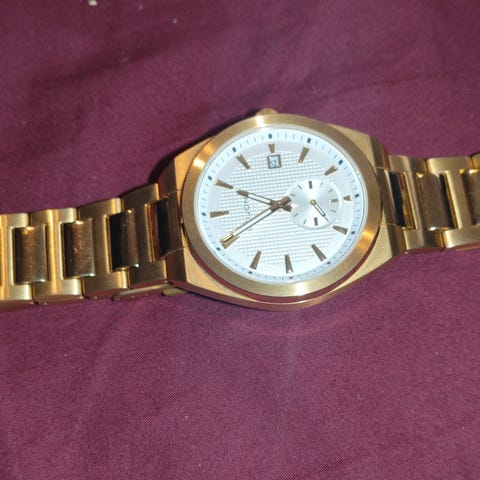 Leijona miesten rannekello, jossa on teräsranneke. Kellon takakannessa on kaiverruksia ja mallinumero 5012-1851. Kellossa on musta kellotaulu ja päivämäärän näyttö.