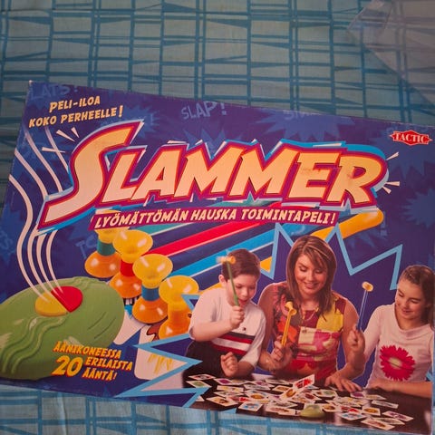 Myyn joutilaaksi jääneen Tacticin Slammy-pelin. Peli sopii 5-12-vuotiaille lapsille ja 2-4 pelaajalle. Pelissä kaikki osat tallessa: 35 Slammy-korttia, 15 kierroskorttia, 4 Slammy-mailaa ja sääntövihkonen. Kortit ja mailat moitteettomassa kunnossa. Pelilaatikon kannen yksi kulma ottanut osumaa. Katsothan kuvista tarkemmin.