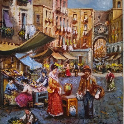 Upea mestariteos, tekijä A. Pecorelli, öljy kankaalle 50 x 40 cm, joka esittää viehättävän vanhaa pariisilaista kohtausta puistossa. Upea maalaus, jossa on lukuisia hahmoja ja värisävyjä, pehmeät ja materiaaliset siveltimenvedot; huomataan mestarin erinomainen maalaustaito, ihanat värit on kauniisti yhdistetty toisiinsa, mikä tekee taulusta harmonisen ja elegantin. Takakannessa signeeraus ja taiteilijan lyhyt elämäkerta. Peräisin yksityiskokoelmasta ja lähetys on seurattavissa.