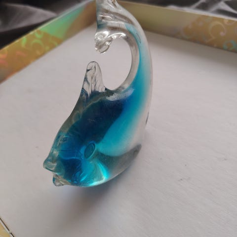 Llasinen kala koriste-esine, jossa on kirkas ja värikäs lasimuotoilu. siinä on oranssin, mustan ja keltaisen sävyjä.