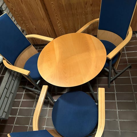 Martelan iso soikea pöytä ja 6 tuolia. Pöydässä on puupinta siistissä kunnossa,jalat ovat hopeanväristä metallia. Tuolissa selkänoja on samaa puuta istuinosa verhoiltu,jalat hopeanväristä metallia.