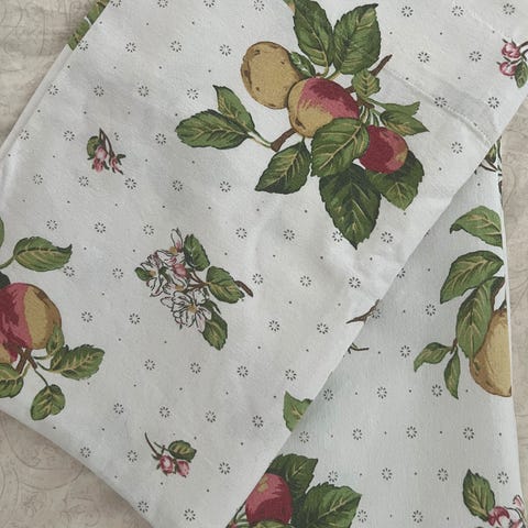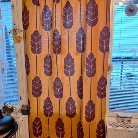 Vanhat, haalistuneet puuvillaiset omppuverhot. Verhoissa on muutamia reikiä ja tahroja. Lev. 148 cm ja korkeus 168 cm. Yhteishinta.