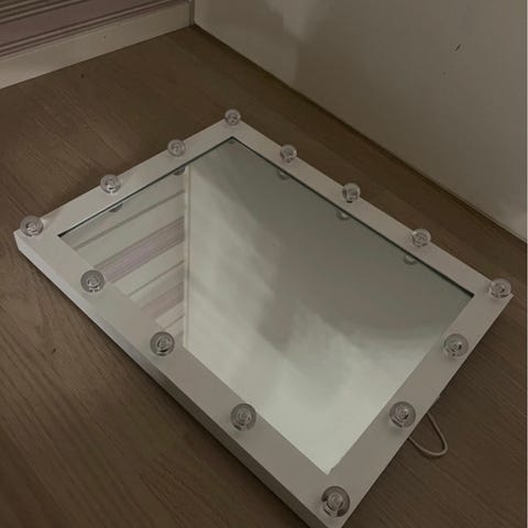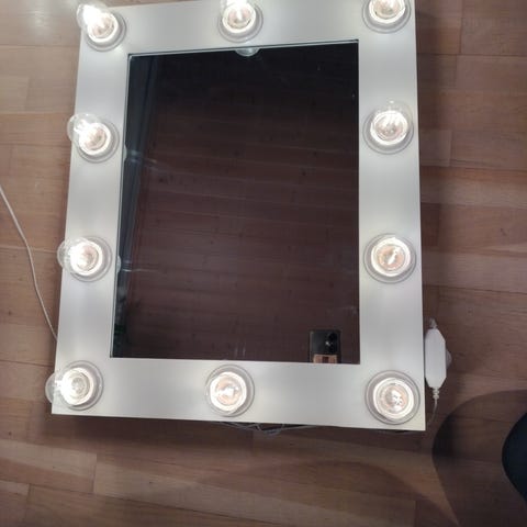 Clas Ohlson valkoinen suht. iso meikkipeili himmennettävillä valoilla. Voi laittaa seinälle tai pöydälle. Hyvä kunto.