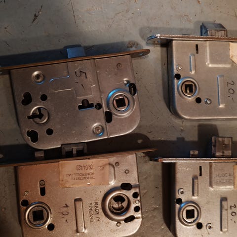 Metallinen avainlukko sarja, väriltään kromi. Valmistettu Suomessa. Sisältää avaimet 2+2 kpl. Jäivät aikanaan ylimääräiseksi.
