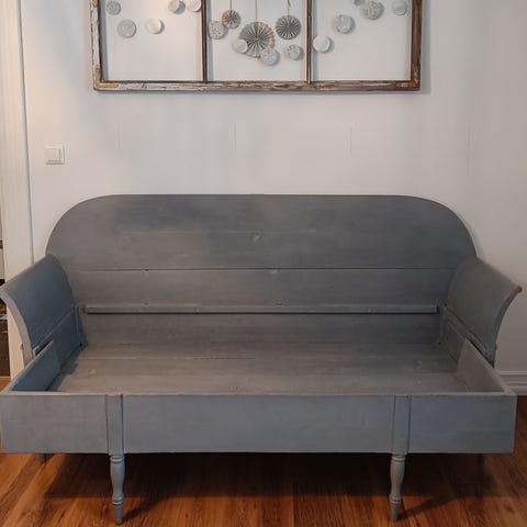 Hakusanat: puu, puinen, sohva, sohvat, puurunko, penkki, vihreä, huonekalu, huonekalut, rustiikki, säilytystila, käytetyt huonekalut