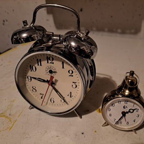 Kaksi vanhaa kelloa, herätyskello, matkakello