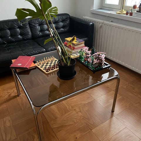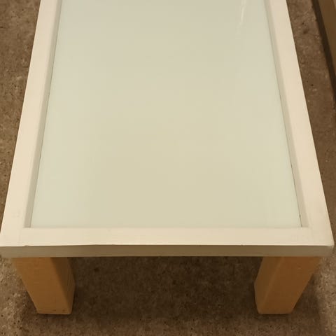 Messinkijalkainen sohvapöytä / sivupöytä lasikannella. Jaloissa pientä kulumaa.