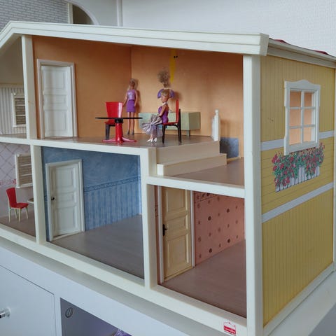 Lundby nukkekoti, jossa on kaksi kerrosta ja useita huoneita. Sisätilat on sisustettu eri tapeteilla ja lattiamateriaaleilla, mukaan lukien ruutukuvioitu lattia ja kukkakuvioiset seinät. Nukkekodissa on portaat kerrosten välillä ja useita ovia. Sopii lasten leikkeihin. Pieniä rikkoutumia on joissain tapeteissa yms. Jotkut pistorasioista toimivat. Voi noutaa.