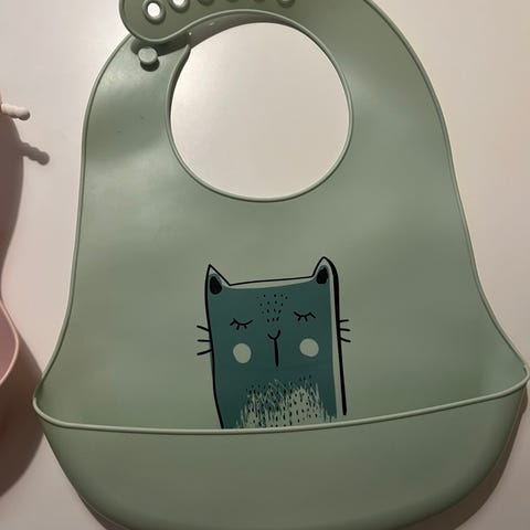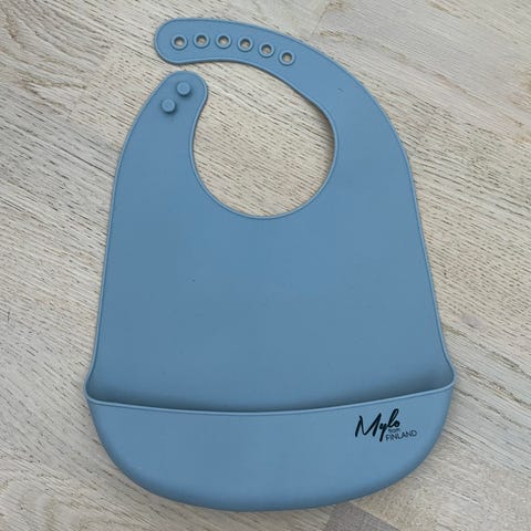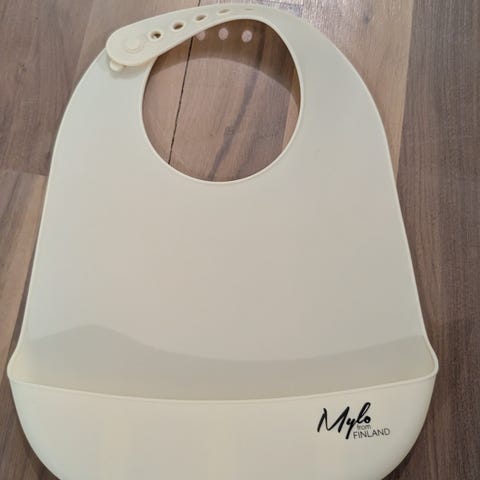 Mylon silikoninen musta ruokalappu. Yhdellä käytetty. Mylon merkki ehjä, hankala saada kuviin kun on musta teksti.