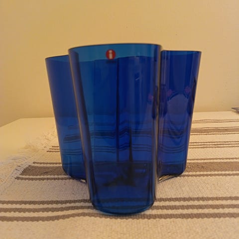 Iittala Aalto maljakko uusiolasi.Suunniteltu orgaanisella muodolla, valmistettu kirkkaasta lasista. Sopii kukkien ja koriste-esineiden esillepanoon.