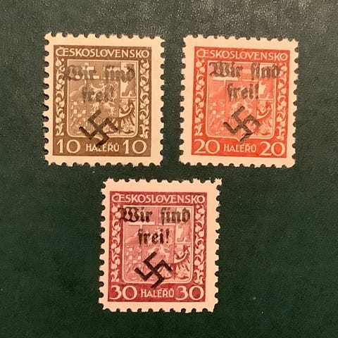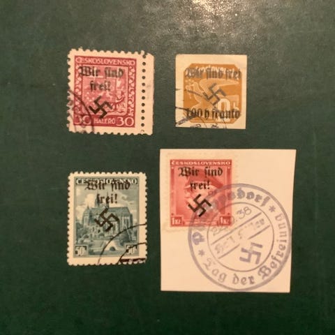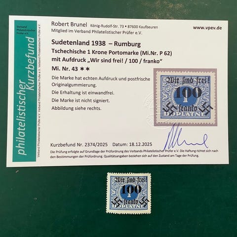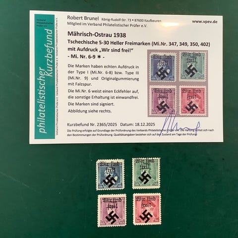 Bohemia ja Moravia 1938 - Rumburg: 4 Kc leimaa, joissa lukee 'wir sind frei'