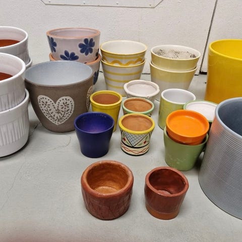 Erilaisia suojaruukkuja, metallisia on 3kpl päällekkäin. Löytyy myös yksi amppeliruukku joka ei kuvassa.