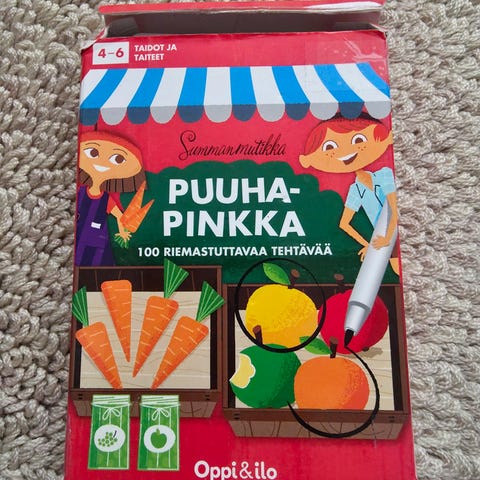 Oppi&ilo puuhapinkka 4-6 vuotiaille. 50 korttia eli yhteensä sata tehtävää. Muutaman kerran tehdyt. Tussi jo aikansa elänyt ja kärki painunut hieman mutta piirsi edelleen.