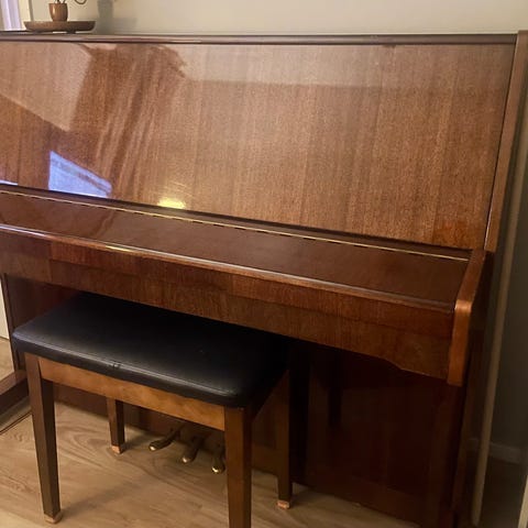 Pystymallinen piano, jossa puuviilupintainen viimeistely. Sisältää pianotuolin. Sopii musiikin soittamiseen ja harjoitteluun.