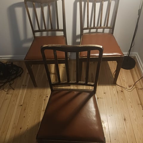 Pehmustetut, istuin osassa hyvät jouset. Ammattilaisen päällystämät / entisöimät tuolit. Yhteishintaan. Katso myös pöytää joka on myynnissä.