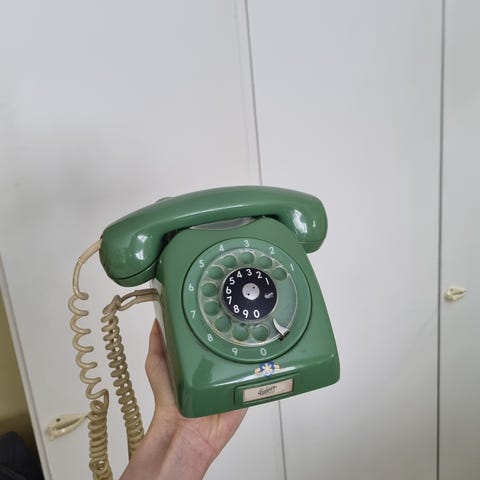Retro lankapuhelin pyöritettävä jossa on perinteinen numerovalitsin ja klassinen beige väri. Sopii leikkeihin tai sisustukseen.