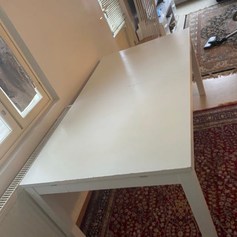 Ikean jatkettava pöytä ja 6 tuolia. Pöydässä käytön jälkiä. Pöydän Mitat P 175 L 95. Jatkopaloja on 2 kpl ja yhden L 42.5. Ainoastaan nouto Itä-Aure.