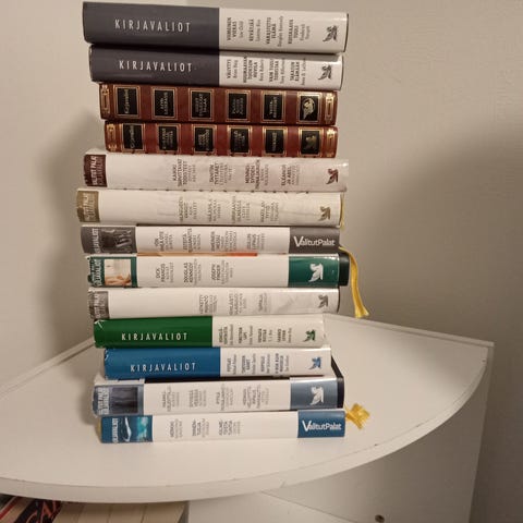 Hae pois. Annetaan kaikki samalla kerralla. En lähetä enkä kuljeta mihinkään. Kuvista näkee mitä kirjoja pinoissa on.
