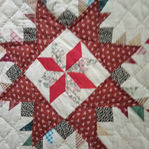 Kelta sävyinen käsin tehty iso tilkkutäkki.