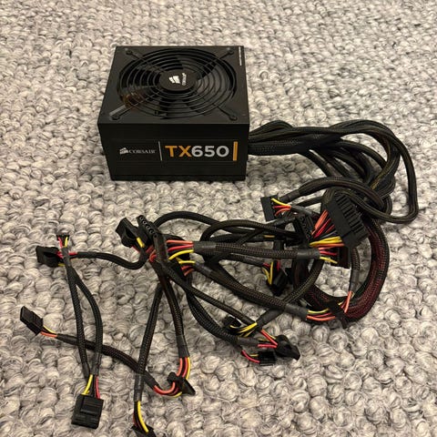 Alkuperäinen paketti, kaikki johdot, kiinnitysruuvit, nippusiteet ja seinään menevä virtajohto löytyvät. +10e hinnasta mukaan Phanteksin universaalit puna-mustat jatkokaapelit emolevylle ja prosessorille kaapelikampojen kanssa (viimeinen kuva).
