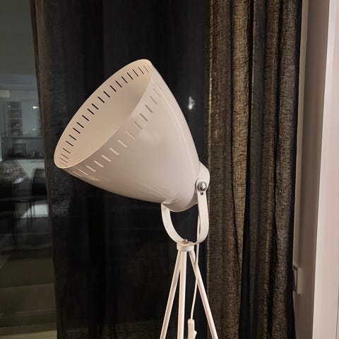 'Kullan' sävyinen jalkalamppu, 2 eri valoa, säädettävissä erikseen. Himmennettäviä myös, joten saa ihanaa vaihtelua, jos haluaa tunnelmallisemmman taikka kirkkaamman valon! Merkkiä en valitettavasti tiedä.