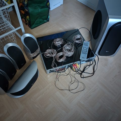 Myydään LG:n kotiteatteri. Toimii niin kuin pitää, kaukosäädin yleismalli koska koira näytti pentuna alkuperäiselle hammasta.