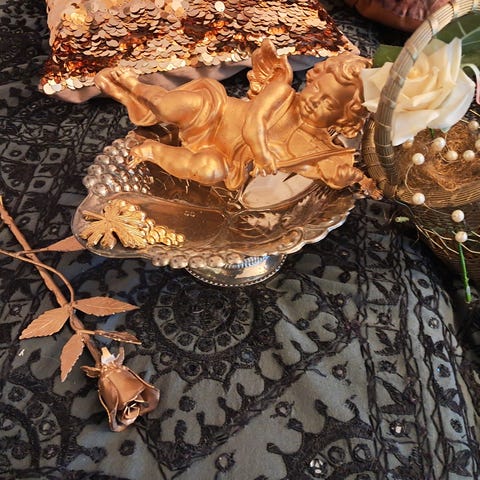 • Pinkkimustat metalliset koristeet: Holiday -kyltti jalalla ja pieni päivänvarjo.
