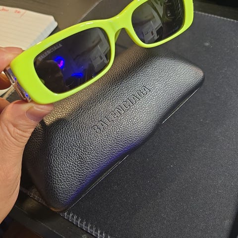Stylish Balenciaga sunglasses in black with dark lenses. Comes with original Balenciaga case and cleaning cloth. Lightweight and comfortable design, perfect for everyday wear.