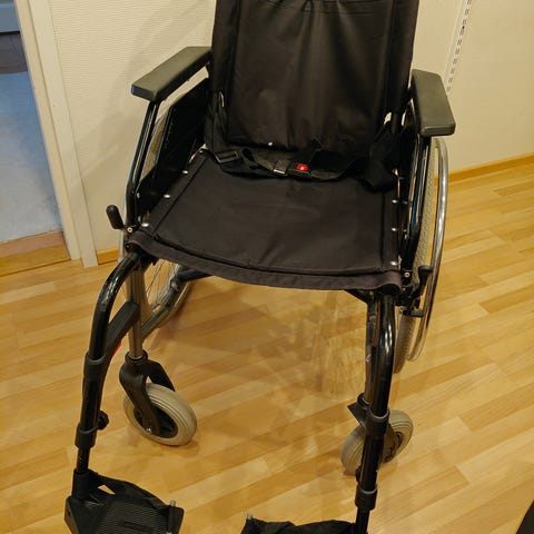 tästä käytetty,toimiva,monipulinen,kevyt rullatuoli vaikka kakkos tuoliksi.Mustan ja sinisen värinen pyörätuoli, jossa on kääntyvät etupyörät ja suuret harmaat takapyörät,jotka saa lukittua Istuin ja selkänoja ovat mustat ja pestävissä Sopii sisä- ja ulkokäyttöön.Invacare Action3 NG. tee tarjous