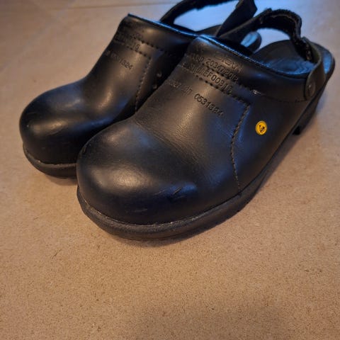 Sievin mustaoranssit turvakengät, koko 38. Kätevä tarrakiinnitys, päällä ilmastointiaukot, joten menevät lämpimälläkin ilmalla.