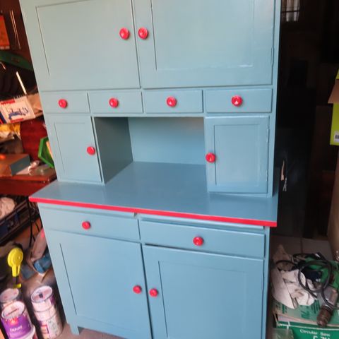 40-50 luvulta emännänkaappi joka on huolella kunnostettu. Poistettu vanhat maalit . Hiottu huolella . Tikkurilan pohjamaalilla pohjustettu. Pintaan Tikkurilan Helmi 30 puolihimmeä valkoinen. Ovet ja laatikoiden etuosat maalattu vihertävän harmaalla. Kaappiin on laitettu paljon uutta esim. Leikkuulaudat, laatikoiden pohjat, takavaneri sekä ovien saranat . Huomaa kaaapin pyöristetyt kulmat. Kaappi on yksiosainen.