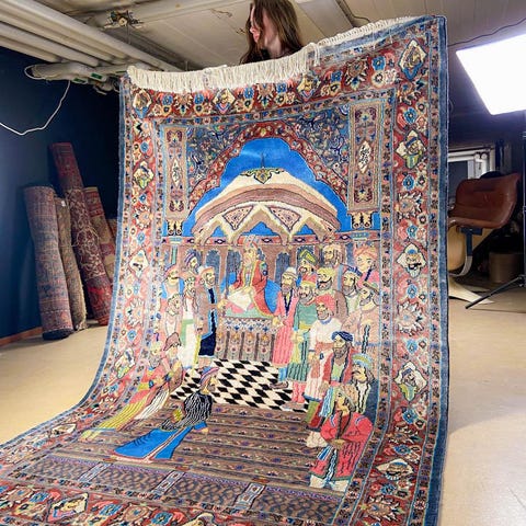 Juhlallisen koristeellinen vaalea Kashmar uskomattoman yksityiskohtaisella kuvioinnilla. Kuvioinnista löytyy perinteiseen Kashmar-tyyliin rönsyilevä kokonaisuus vaaseja, eläimiä ja kasvillisuutta.