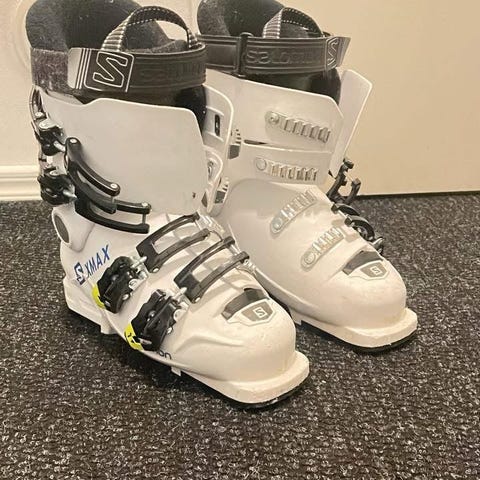 Salomon Max laskettelumonot, koko 26.5, väri valkoinen. Monot on varustettu neljällä soljella ja tarranauhalla nilkan ympärillä.