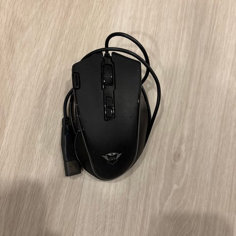 Avaamaton paketti, jossa Trust pelihiiri sekä hiirimatto.