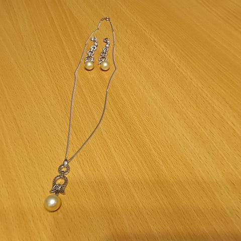 Kaunis kaulakoru hopeaa ja siihen kuuluvat korvakorut