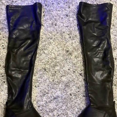 Käyttämättömät tummansiniset ylipolvensaappaat koko 39, pohjan sisäpituus n. 25,3 cm. Ulkopuoli keinonahkaa, kevyesti pehmustettu tekstiilivuori. Korko 11,5 cm, pohjan leveys 8 cm, varren korkeus 30 cm, varrensuun leveys 36 cm. Huom! Saappaat säilytetty laatikossa varret taitettuina, nilkoista edestä ja takaa pintamateriaali muutamasta paikasta hilseilee ks. kuvat.