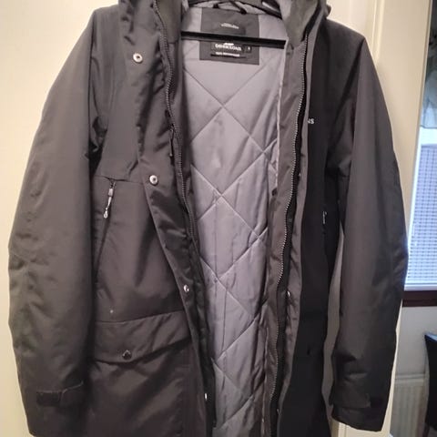 Siisti, vain muutamasta käytetty talvitakki. Kaksisuuntainen vetoketju, kiristysnyörit vyötäröllä, hupussa ja helmassa. Kosteuden kestävä, lämmin takki.