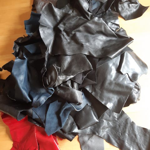 Ohuempaa pehmeää nahkaa. Eri sävyisiä. Pieniä paloja. Kaupanpäälle nuo siniset palat. Oisko jotain mokkanahkaa.
