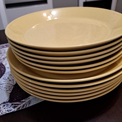8kpl Teeman keltaisia ruokalautasia 26cm. Täysin ehjiä, mutta normaaleja käytön aiheuttamaa pintanaarmua, osassa enemmän ja osassa vähemmän. Lisäksi kaupan päälle kaksi lautasta, joista lohjennut palaset, kts. viimeinen kuva.