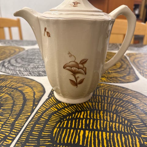 Arabia kukkakuvioinen teekannu. Tellervo sarjaa. Kannessa ja nupissa lohkeama. Nuppi kiinnitetty.