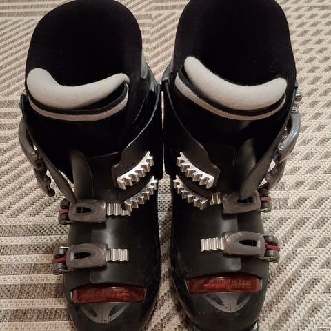 Dolomite laskettelumonot mustaa ja punaista väriä. Monot on varustettu kolmella soljella ja pehmeällä sisävuorella. Sopivat lasketteluun ja tarjoavat tukea ja mukavuutta jalalle.