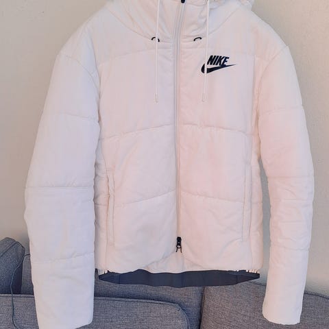Hyväkuntoinen Nike toppatakki. Takki on kääntötakki ja toisella puolella iso Nike-logo. Molemmilla puolilla on taskut.