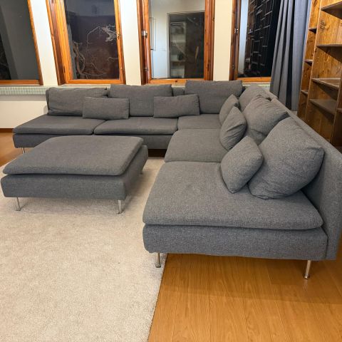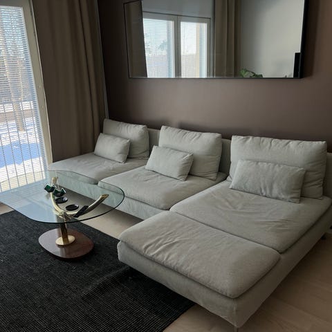 Kahdesta osasta koostuva kulmasohva käsinojalla. Kunto tosi hyvä, jalat vaihdettu tammisiin. Myös alkuperäiset jalat löytyvät halutessa mukaan! Mukana selkätyynyt sekä kaksi pienempää Ikean tyynyä.