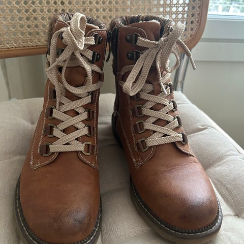 Konjakinuskeat talvikengät koossa 38. Kengät on valmistettu nahkamateriaalista ja niissä on vetoketju ja solki sivulla. Sopivat käytettäväksi kylmillä sääolosuhteilla.