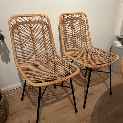 4 kpl rottinkituoleja. Keittiön tuoleina meillä n 2 vuotta palvelleet tuolit uuteen kotiin. Eivät siis ole uusia mutta siistissä kunnossa. Ehjät, mutta muutama rottinkikalusteelle ominainen purkauma parissa tuolissa (kuvat). Sijainti lamminpää. Ei pysty kasaan päällekkäin.
