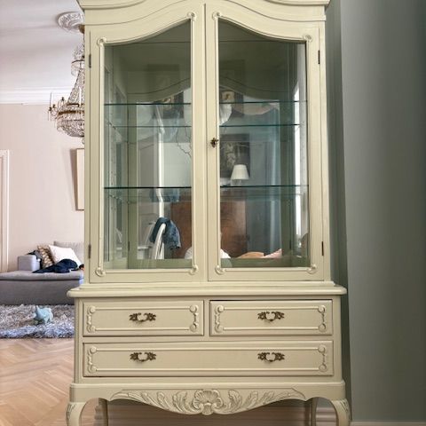 Hakusanat: koristeellinen, lasiovet, talonpoikaisrokokoo, talonpoika, valkoinen kaappi, rokokoo, rauta, vitriinikaappi