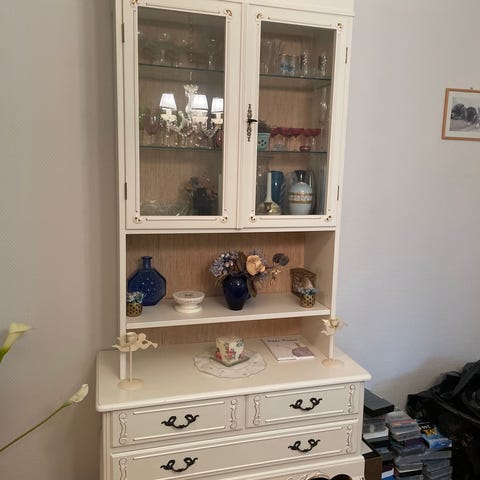 Valkoinen talonpoikais vitriinkaappi metallisilla koristeilla. Toinen vedin on rikki, pinnoilla likaa.