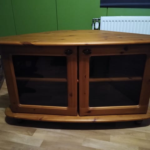 Lasinen, hyväkuntoinen, kolmitasoinen tv-taso, joka soveltuu hyvin myös sohvapöydäksi. Pöydän pitempi puoli pisimmältä kohdaltaan on mitaltaan 119cm ja lyhyempi vastapuoli 108 cm.