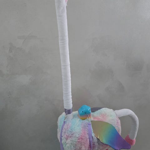 Iso n 45cm korkea värikäs eläin joka ääntelee. Sille voi syöttää esim käpyjä tai palloja, jotka vierii alas. 10€