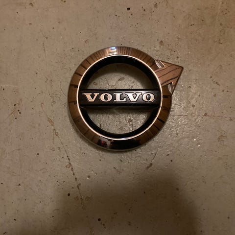 Metallinen Volvon 144 merkki. Leveys 14,5cm, korkeus korkeimmalta kohdalta 4,6cm. Hyväkuntoinen.